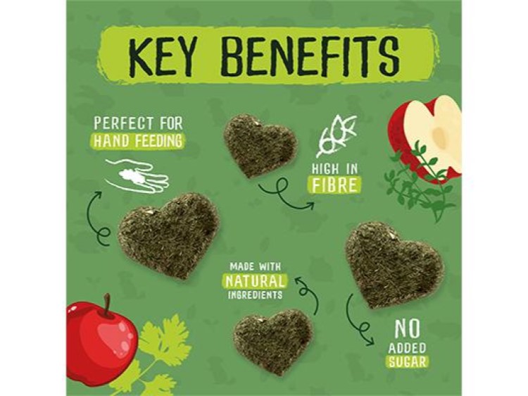 Burgess Excel Herby Hearts 60G snacks er velsmagende og sunde snacks til kaniner og gnavere og ideel til håndfodring. Excel Herby Hearts er bagte godbidder med æble og blandende urter. De er ikke tilsat sukker, kunstig farve eller smag og det kan kaniner og gnavere godt lide.