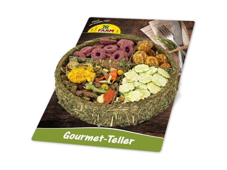 JR Farm Gourmet Tallerken. Middagen er serveret! Et farverigt udvalg af aromatiske og artstilpassede godbidder fortryller smådyr og dværgkaniner med en uimodståelig menu. Gourmet tallerkenen indeholder JR Grainless Health fuldfoder der er harmonisk kombineret med vitaminrige gulerøddrops, rødbederinge og velduftende ærteflager.
