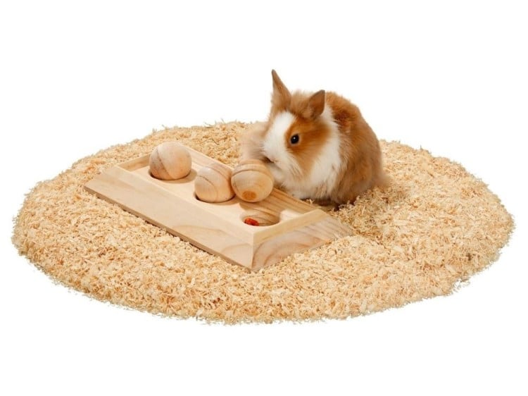 Intelligenslegetøj som består af trækugler med madplade. Din kanin lærer på en sjov måde at arbejde for at få mad. Gem frugt, snacks, eller grøntsager i hullerne. Din kanin kan lege med næsen og poten og få masser af tid til at gå.